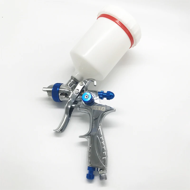 b) Мини-краскопульт наоборот с минимально возможным объемом бачка. Плюсы: проще окрасить поверхность размером ок. 20*20 см, расход воздуха тоже вроде небольшой от 30 л (видимо при минимальной дюзе 0,3). Минусы: думаю невозможно окрасить локально небольшие сколы.