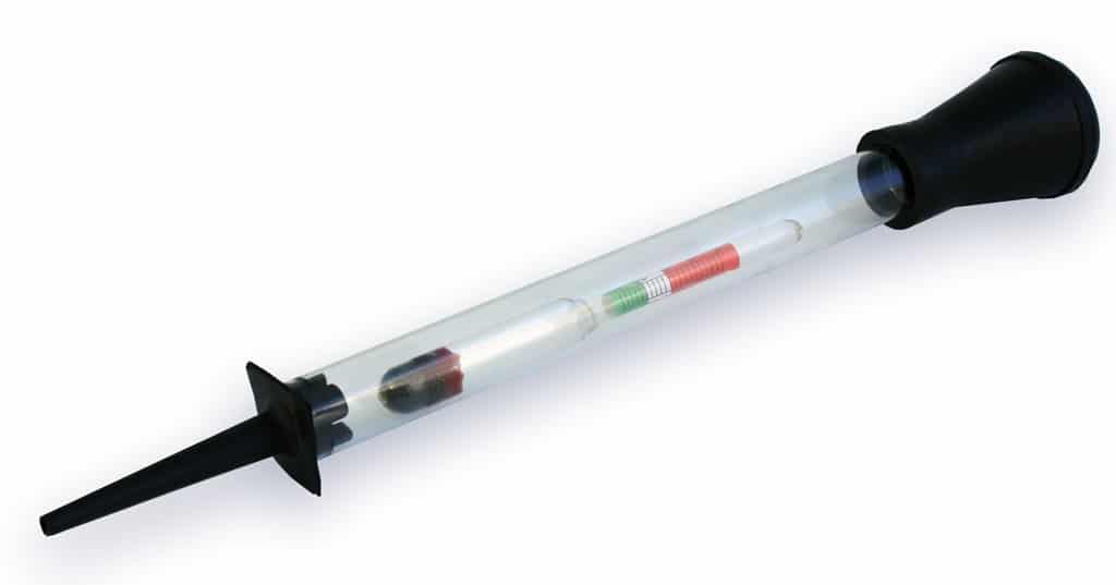 Не стоит забывать, что не только уровень кислоты, но и её плотность являются важной характеристикой работоспособности батареи. Получить данные о плотности раствора можно с помощью ареометра. Возьмите шприц, введите его в отверстие на крышке и осуществите забор электролита из банки. Влейте в ареометр и посмотрите показания. Слишком низкая плотность (менее 1,22 г/см3 при температуре до +6) не даёт возможности аккумулятору полноценно работать и говорит о малом количестве электролита и необходимости его восполнения. Повышенная плотность или недостаточный уровень раствора требует доливки дистиллированной воды.