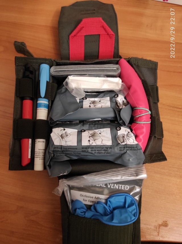 Комплект носимой армейской аптечки солдат США (Individual First Aid Kit) состоит из 14 позиций. Там предусмотрен зажим для остановки артериального кровотечения, щиток для глаза, большое количество перевязочных средств, таблеток для очищения воды и антибиотики Бацитрацин.