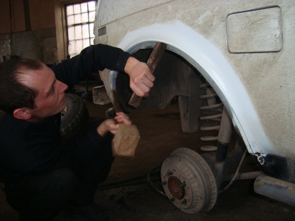 Для доступа к нужной части кузова с автомобиля снимается колесо. Подготовленная поверхность покрывается фрагментами горячей «вибры» и тщательно прикатывается специальным металлическим валиком.