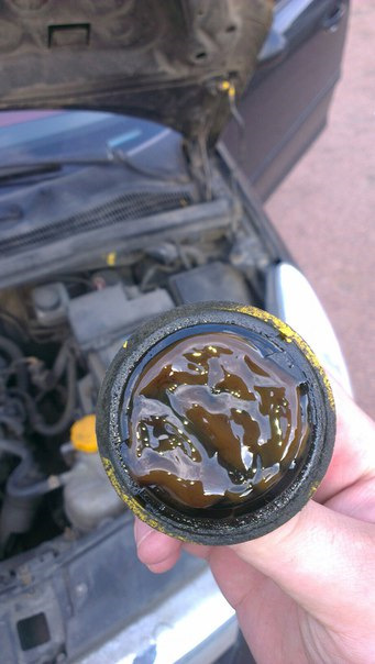 Чтобы проверить эти причины, смазочную жидкость сливают из достаточно прогретого двигателя в заранее подготовленную емкость. В горячем масле даже невооруженным глазом будут видны следы ОЖ, которые по мере остывания превратятся в эмульсию. Если в тосоле много воды, тогда большая его часть станет скапливаться под слоем на дне картера. Естественно, эту жижу будет всасывать маслоприемник. Если образовалась желтая эмульсия на крышке маслозаливной горловины, тогда лучше временно отказаться от эксплуатации автомобиля. Вязкая смесь забьет каналы для движения смазки. Шатунные вкладыши, кольца поршней, коренные подшипники с такой жидкостью быстро выйдут из строя.