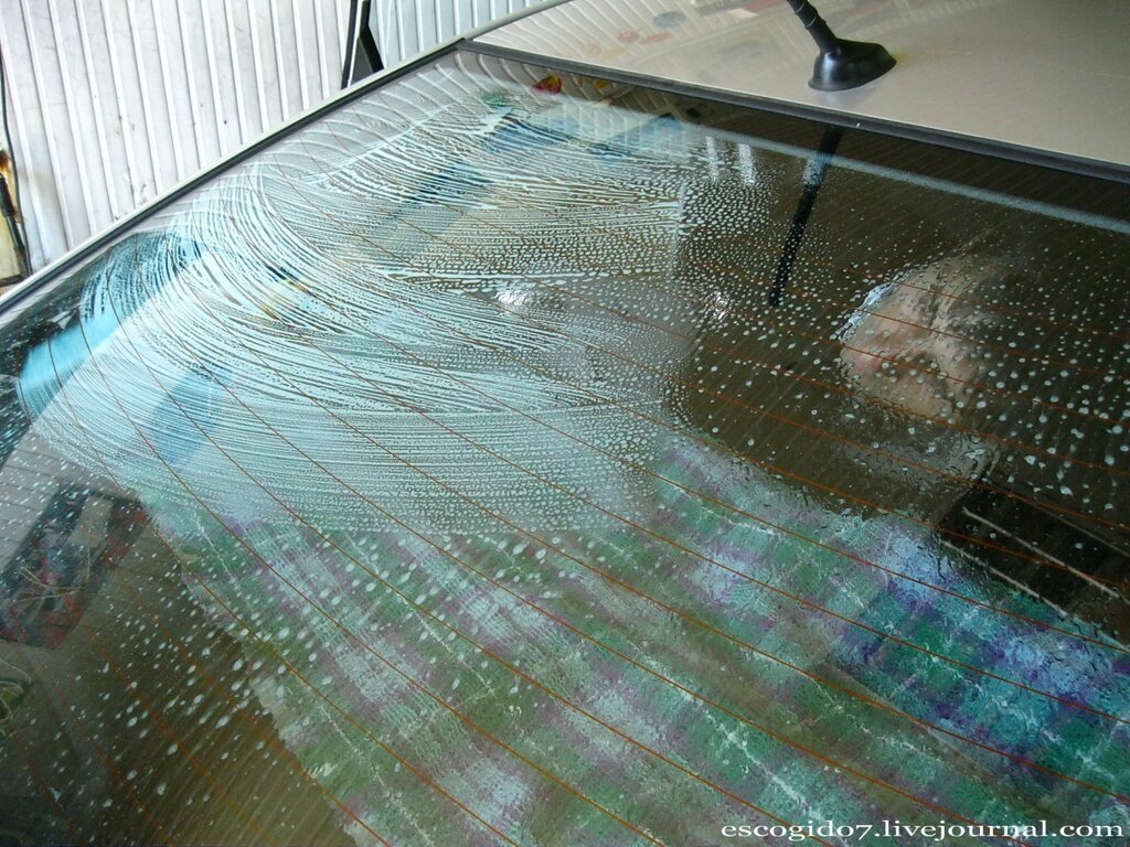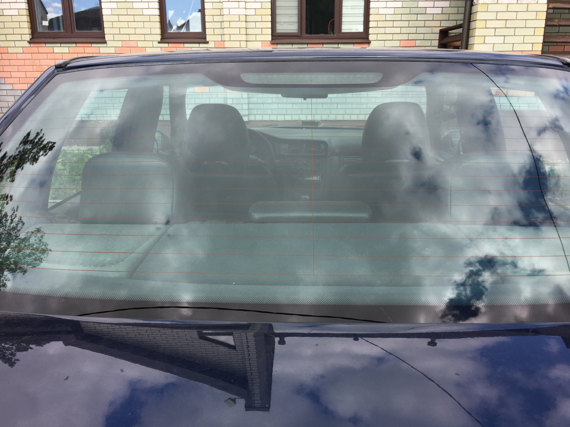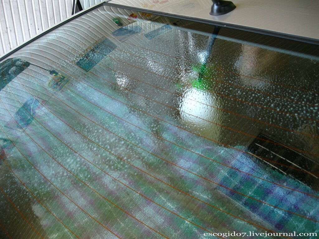 Что касается растонировки заднего стекла, то есть большая вероятность порвать нити обогрева. Поэтому растонировку необходимо проводить по другому сценарию. Для этого понадобится еще кусок полиэтиленовой пленки. Вызераем ее по геометрии пленки, наклеиной на стекло. Затем на тонировояную пленку наносим моющее средство и укрываем вырезанным куском полиэтилена (делаем «баню») и начинаем снаружи нагревать стекло (градусов до 40-50, чтобы было очень теплым). Нагревать нужно равномерно, чтобы не было больших перепадов температуры по площади стекла.