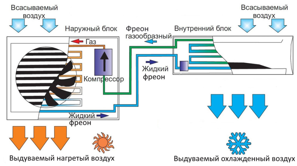 Фреон забирает тепло из атмосферы и переносит его куда-то еще, обычно за пределы вашего дома или офиса.