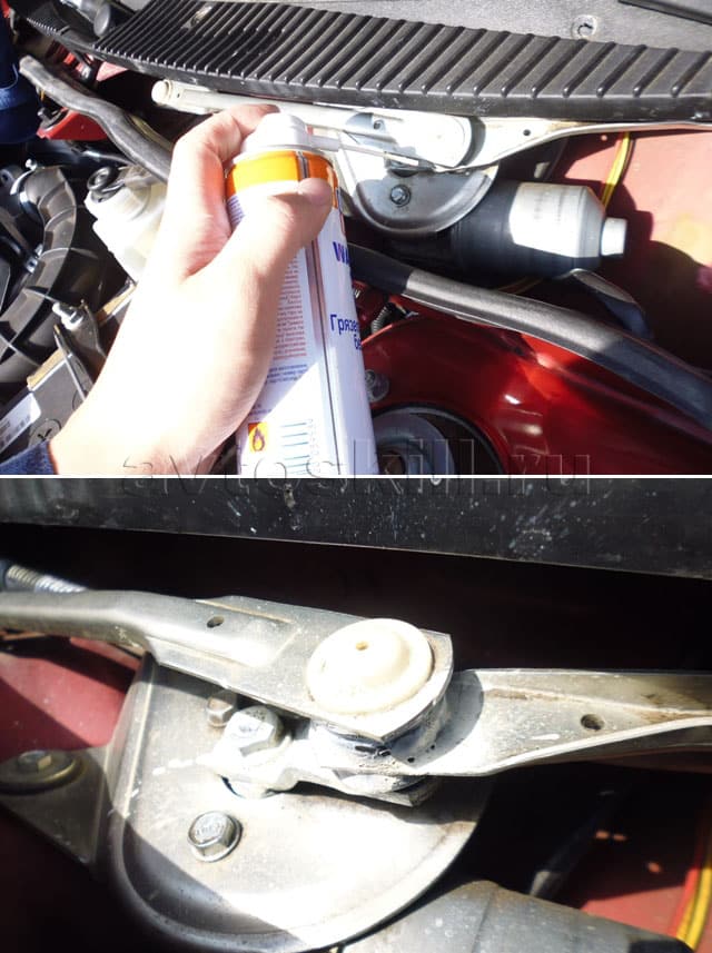 Чтобы исключить скрип дворников, необходимо смазать трапециевидный шарнир. Сложность процедуры будет зависеть от дизайна рюшей. На некоторых автомобилях доступ к трапеции можно получить, сняв пластиковую крышку, закрывающую пространство за моторным щитом. Но на большинстве автомобилей для снятия обшивки потребуется разобрать дворники.
