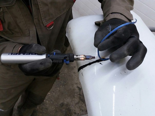 Точки пайки должны быть очищены от старого ЛКП. После прихватки обязательно следует усилить конструкцию изнутри сеточкой либо эпоксидкой и стекловолокном. Для армирования сеточкой достаточно разогретым паяльником утопить ее примерно на середину толщины пластика. С лицевой стороны старайтесь оставлять как можно более гладкую поверхность, так как орбитальной шлифовальной машинки у вас, скорее всего, нет, а руками пластмасса тяжело сошлифовывается.