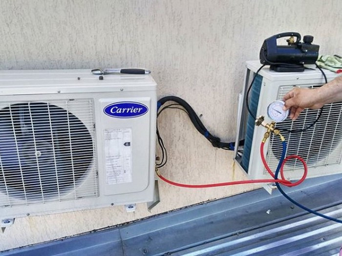 - при помощи специального насоса вакуумируем систему устройства. При этой процедуре вся оставшаяся влага удаляется, а также проверяется герметичность;