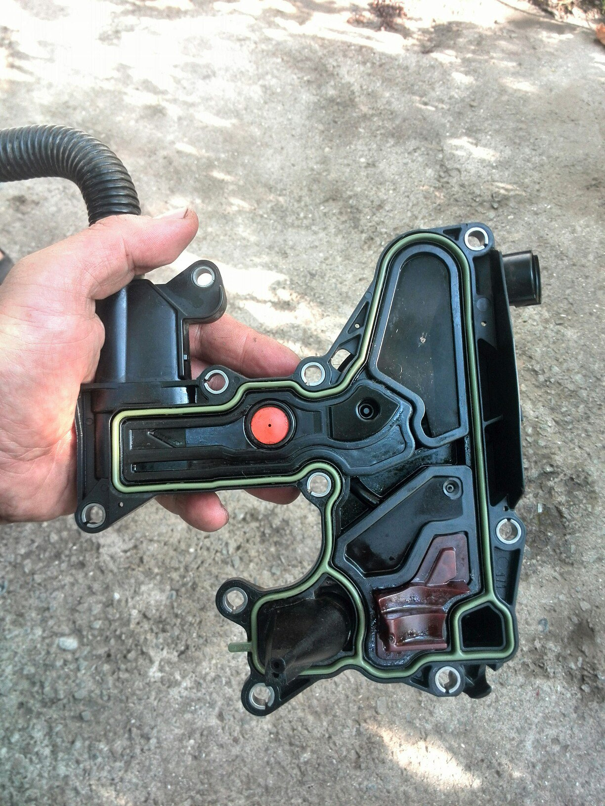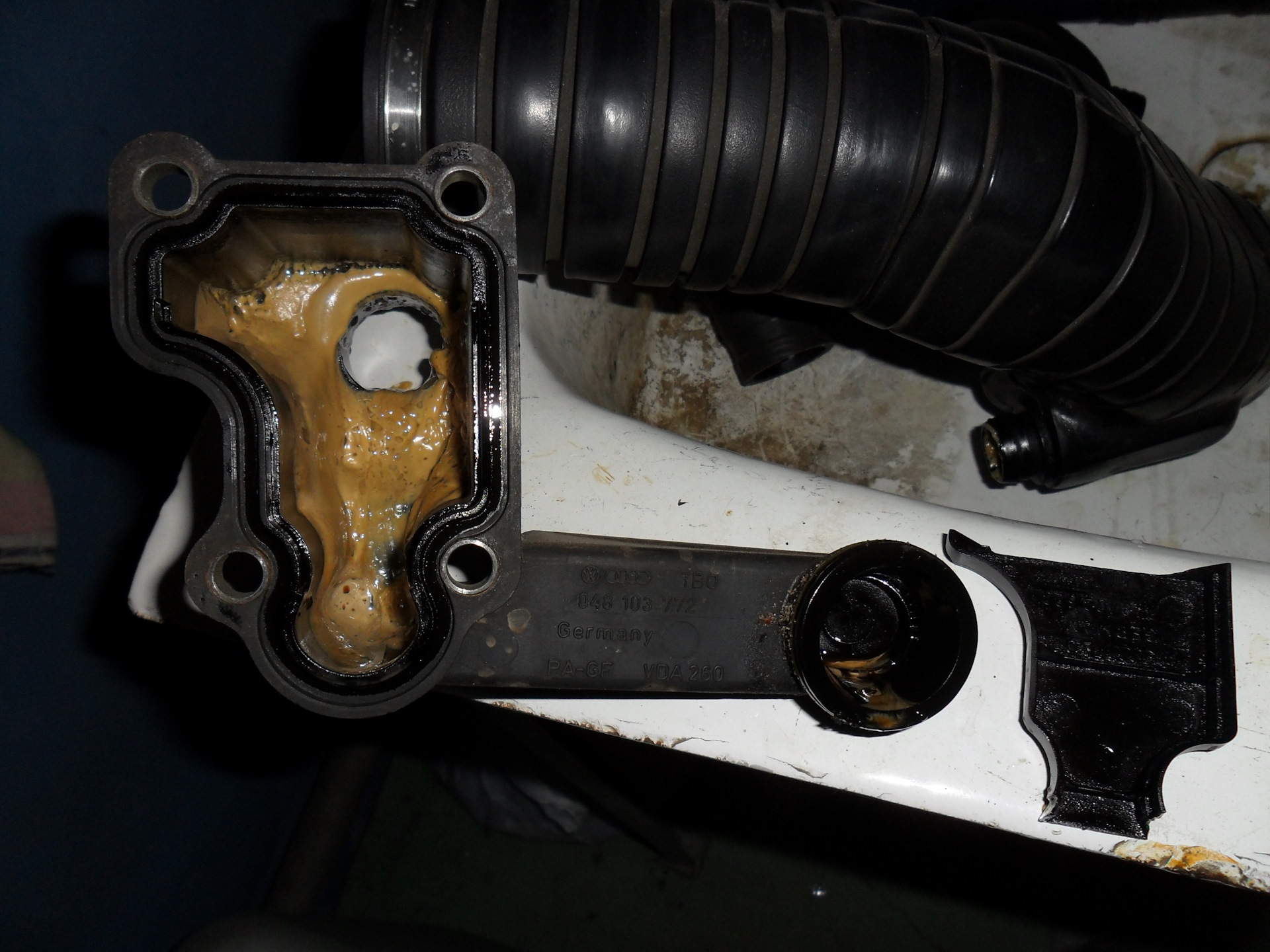 Суть проблемы такова, система ВКГ раздвоенная, одна часть работает по классической схеме, отбирается в клапанной крышке, конденсируется в лабиринте крышки и поступает во впуск, но т.к. мотор компрессорный, то идет это все на всас компрессора, оттуда попадает в интеркулер, а уж оттуда во впуск-расходомер-дроссель-камеры сгорания.