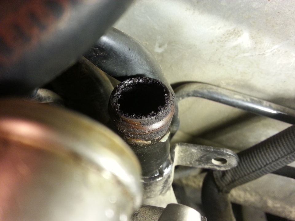 Пробег у нашего автомобиля 150 тыс. км., начало эксплуатации полтора года назад. Также мы попутно заменим патрубок, так как он стал немного деревянным, делается это очень просто, при помощи круглогубцев разжимаем хомуты крепления и снимаем его: