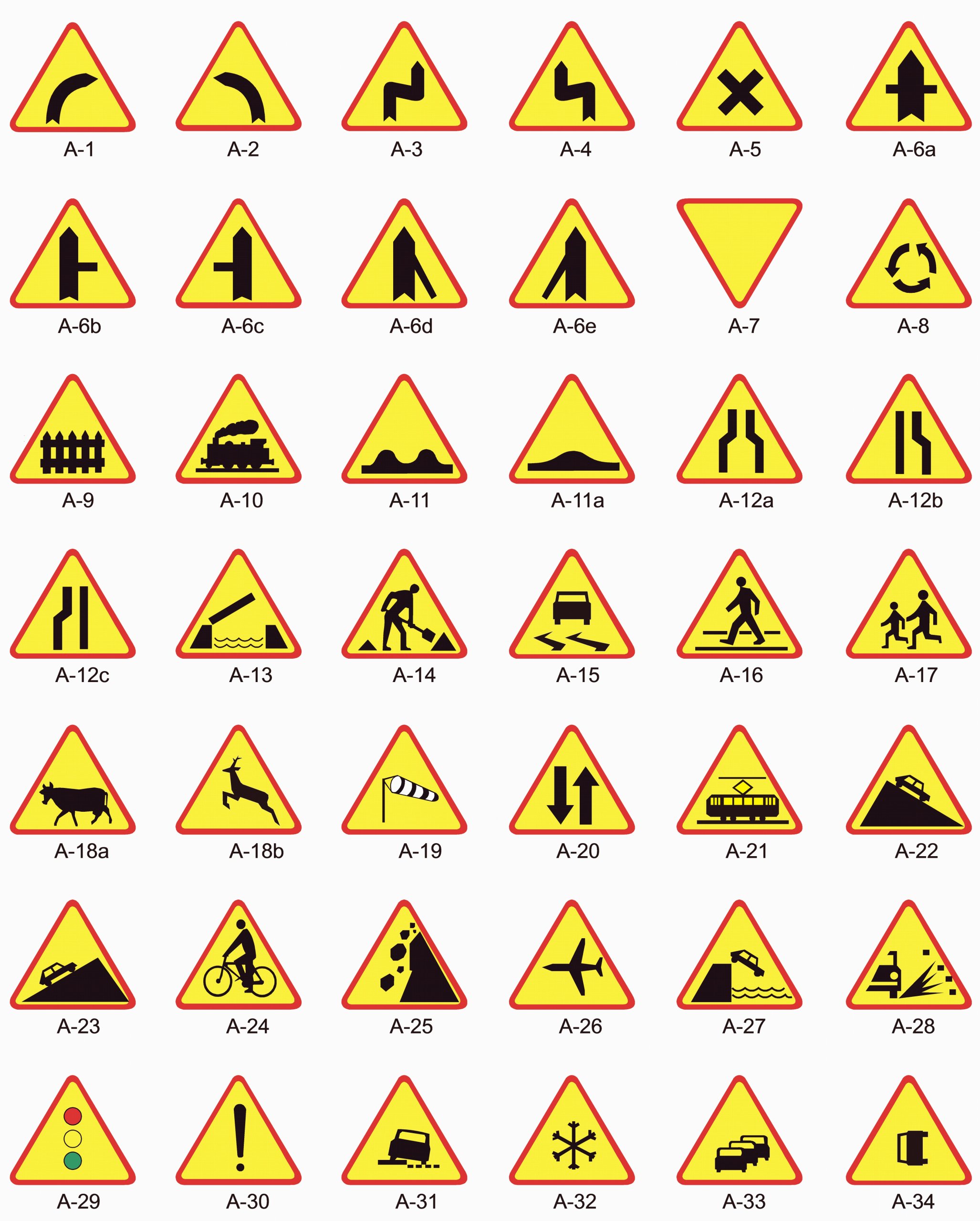 Предупреждающие знаки информируют водителей о приближении к опасному участку дороги, движение по которому требует принятия мер, соответствующих обстановке. Нумерация дорожных знаков соответствует ГОСТу Р 52290-2004.