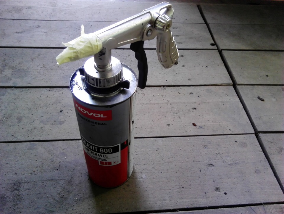 Далее следует, собственно, сама процедура нанесения антигравийного покрытия. Для этого используется уже упомянутый выше специальный пистолет для гравитекса, с помощью которого можно быстро и равномерно распылять средство, или же антигравий наносится без его применения, если куплено средство в аэрозоле.