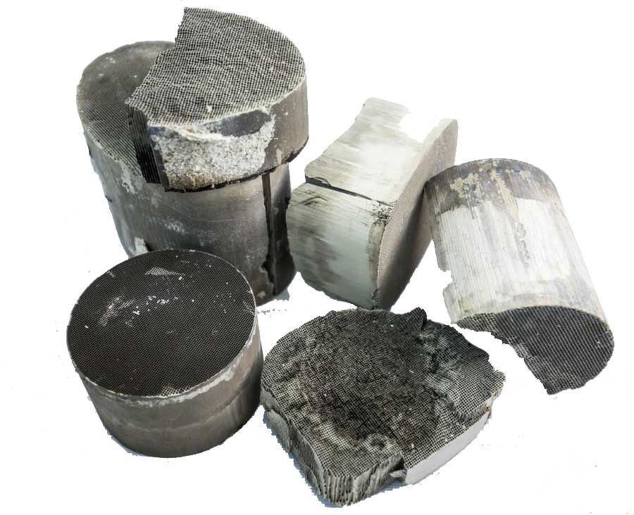 Технически это огнеупорный керамический или металлический цилиндр с сотами, через которые проходят отработавшие газы, в составе которых есть вредные вещества: углеводород, оксид азота, окись углерода. На стенках этих сот есть микрослой веществ-катализаторов: это может быть платина, палладий или родий. Они ускоряют химические процессы, и выхлопные газы после окислительно-восстановительных реакций с этими металлами становятся менее токсичными.