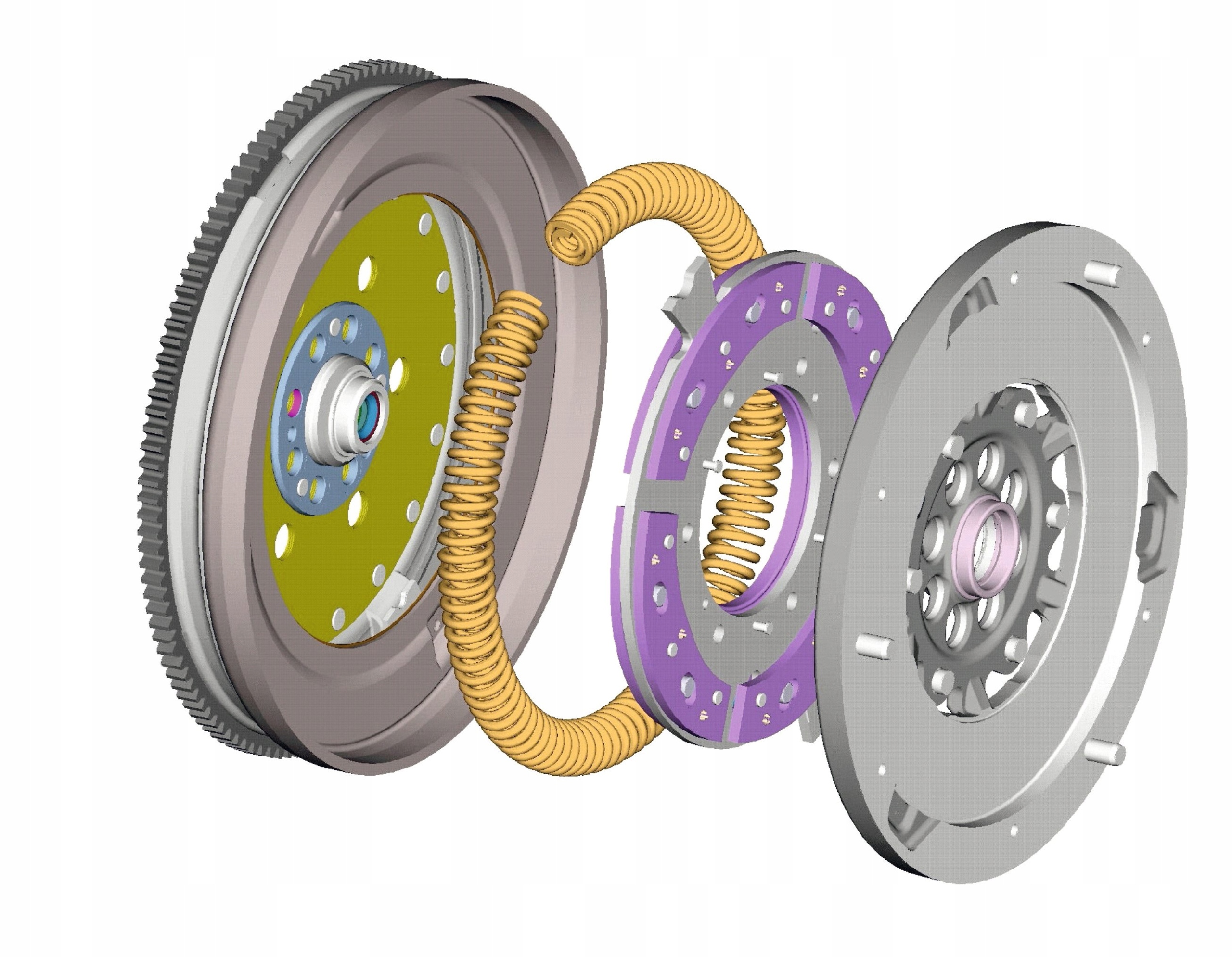 Первичная масса образует большой диск, который вращается вместе с коленчатым валом, а вторичная масса представляет собой меньший диск, который находится внутри него. Пружины физически соединяют две массы, поэтому, когда первичная масса вращается, вторичная масса также находится под влиянием пружин. Пружины являются ключевым компонентом, поскольку они максимально уравновешивают любые неприятные вибрации, прежде чем они достигнут вторичной массы и трансмиссии.