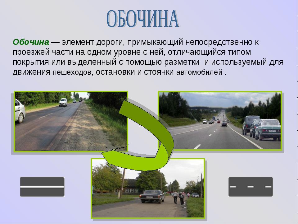 «Обочина» — элемент дороги, примыкающий непосредственно к проезжей части на одном уровне с ней, отличающийся типом покрытия или выделенный с помощью разметки