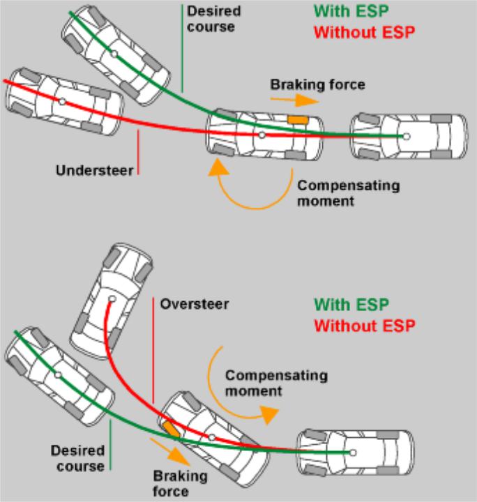 Электронная система стабилизации активна и работает в любом режиме движения — будь то разгон, торможение или езда накатом. А алгоритм ее работы зависит от каждой конкретной ситуации. Умная ESP даже может регулировать режим работы автоматической трансмиссии, снижая передачу или переходя в зимний режим работы, для сглаживания реакций.