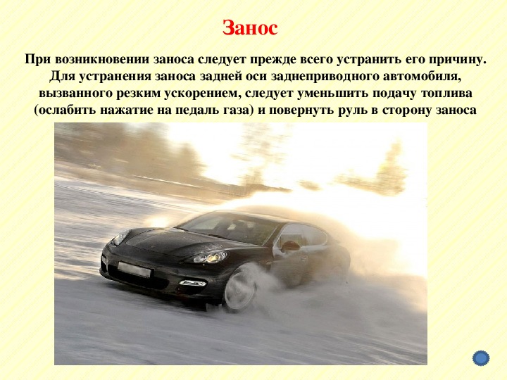 Коррекция заноса заднего привода: Если задняя часть скользит, довольно интуитивно решить проблему, въезжая в занос, стараясь удерживать автомобиль в том направлении, в котором вы хотите ехать.