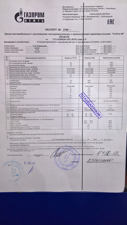 • И, наконец, на каждую партию приобретенного топлива АЗС должна иметь сертификат, висящий в специальном месте, доступном для потребителя. Если сертификата нет, заправляться на данной АЗС не стоит. Если вы все-таки решили заглянуть в сертификат, обратите внимание на дату его выдачи. Количество топлива, равное по объему резервуарам среднестатистической заправки, продается в течение двух — трех дней.