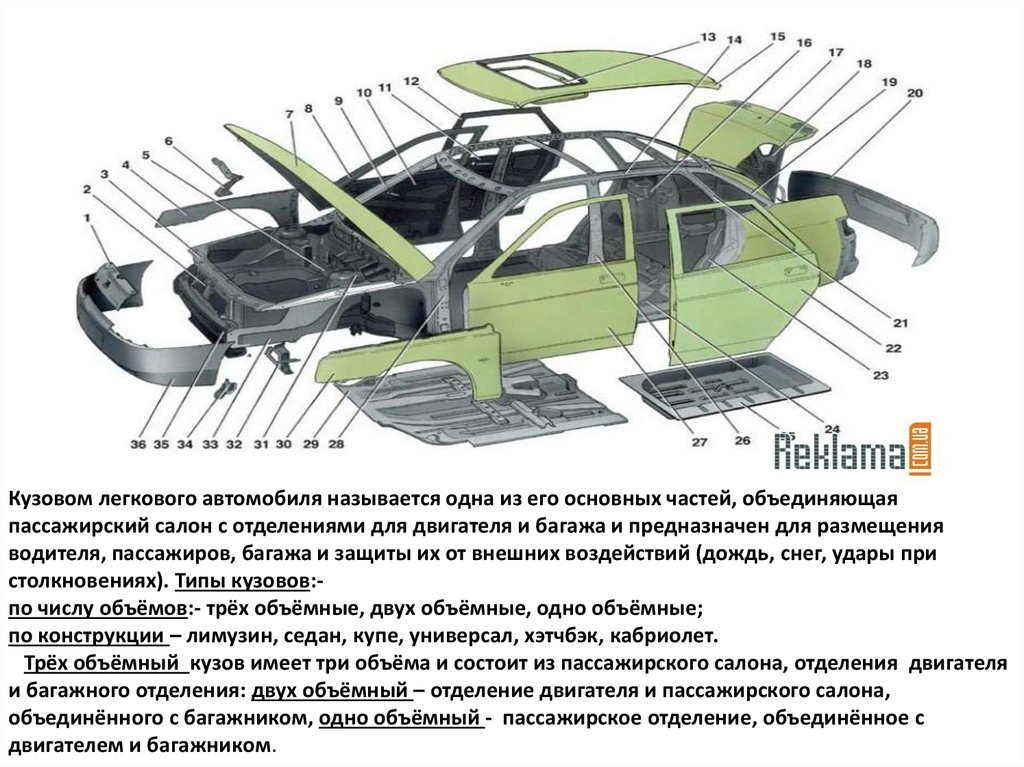 Съемные детали кузова: двери 8, 12, 22, 27, крышка багажника 17, капот 7, передние крылья 4 и 30, бамперы 20 и 36.