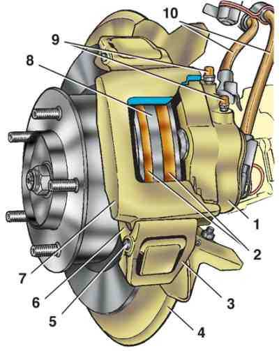 Суппорт закреплен на поворотном кулаке переднего колеса автомобиля (см. рис. 43). В нем находятся два тормозных цилиндра и две тормозные колодки. Колодки с обеих сторон «обнимают» тормозной диск, который вращается вместе с закрепленным на нем колесом.