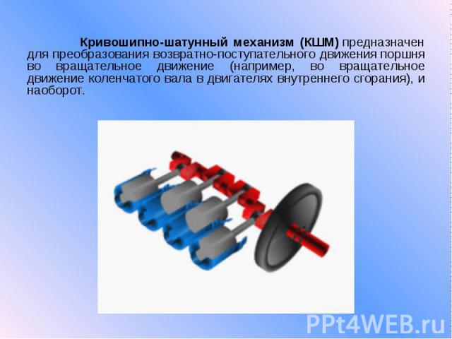- Преобразование возвратно-поступательных движений поршня во вращательное движение коленвала;