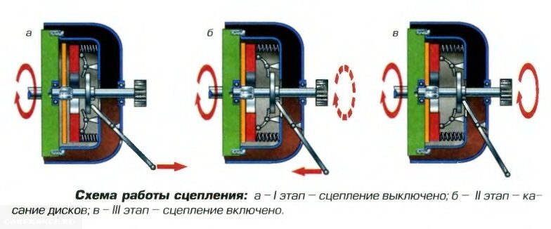 ΠΠ»Ρ Π²ΡΠΊΠ»ΡΡΠ΅Π½ΠΈΡ ΡΡΠ΅ΠΏΠ»Π΅Π½ΠΈΡ Π²ΠΎΠ΄ΠΈΡΠ΅Π»Ρ Π½Π°ΠΆΠΈΠΌΠ°Π΅Ρ Π½Π° ΠΏΠ΅Π΄Π°Π»Ρ. ΠΡΠΈ ΡΡΠΎΠΌ Π½Π°ΠΆΠΈΠΌΠ½ΠΎΠΉ Π΄ΠΈΡΠΊ ΠΎΡΡ ΠΎΠ΄ΠΈΡ ΠΎΡ ΠΌΠ°Ρ ΠΎΠ²ΠΈΠΊΠ° ΠΈ ΠΎΡΠ²ΠΎΠ±ΠΎΠΆΠ΄Π°Π΅Ρ Π²Π΅Π΄ΠΎΠΌΡΠΉ Π΄ΠΈΡΠΊ, ΠΏΡΠ΅ΡΡΠ²Π°Ρ ΠΏΠ΅ΡΠ΅Π΄Π°ΡΡ ΠΊΡΡΡΡΡΠ΅Π³ΠΎ ΠΌΠΎΠΌΠ΅Π½ΡΠ° ΠΎΡ Π΄Π²ΠΈΠ³Π°ΡΠ΅Π»Ρ ΠΊ ΠΊΠΎΡΠΎΠ±ΠΊΠ΅ ΠΏΠ΅ΡΠ΅Π΄Π°Ρ. ΠΠ°ΠΆΠΈΠΌΠ°ΡΡ Π½Π° ΠΏΠ΅Π΄Π°Π»Ρ ΡΠ»Π΅Π΄ΡΠ΅Ρ Π΄ΠΎΡΡΠ°ΡΠΎΡΠ½ΠΎ Π±ΡΡΡΡΡΠΌ, Π½ΠΎ Π½Π΅ ΡΠ΅Π·ΠΊΠΈΠΌ, ΡΠΏΠΎΠΊΠΎΠΉΠ½ΡΠΌ Π΄Π²ΠΈΠΆΠ΅Π½ΠΈΠ΅ΠΌ Π΄ΠΎ ΠΊΠΎΠ½ΡΠ° Ρ ΠΎΠ΄Π° ΠΏΠ΅Π΄Π°Π»ΠΈ.