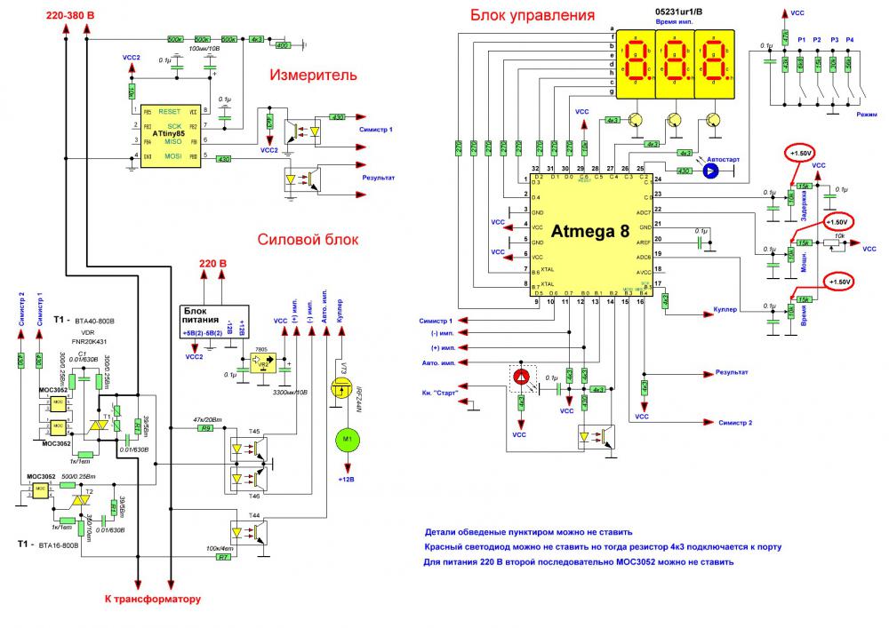 Силовая электрическая схема споттера давно прошла стадии разработки, экспериментов и используется для рихтовки авто в разнообразных вариантах. После приобретения опыта работы с устройством возник вопрос автоматического управления режимами работы устройства с более точными регулировками и необходимыми защитами. Споттер с режимом аппарата точечной сварки и споттер как сварочный аппарат для работы электродом должны иметь различную длительность и мощность импульса. Точка сварки может получиться слабой или слишком крепкой, что создаст дополнительные трудности при ремонте авто.