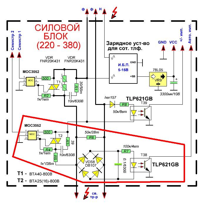 При питании схемы от сетевого напряжения 380 В необходимо использовать симистор типа ВТА40 – 800v, соответственно рабочее напряжение конденсатора С11 630 В, защитные варисторы R14 и R15 типа 20D241. Для установки симистора нужно использовать радиатор. Конструкция элемента безопасна и не имеет соединения с теплоотводом. На радиатор для контроля температуры желательно установить термостат с температурой размыкания контактов 60-80°С.