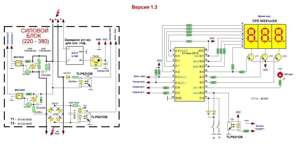 Для споттеров большой мощности можно рекомендовать другой вариант схемы управления тиристорами. В ней применяются тиристоры типа 70TPS12, для управления которыми использованы оптроны МОС3052. Тиристоры этого типа имеют электрическое соединение с теплоотводами и должны устанавливаться на раздельные радиаторы или с диэлектрическими прокладками.