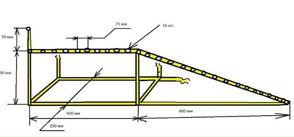 Эстакада – это пара одинаковых сооружений. Сбоку на схеме по форме она напоминает прямоугольную трапецию. Между собой пара горок может дополнительно фиксироваться, чтобы избежать смещения во время подъема на нее машины.