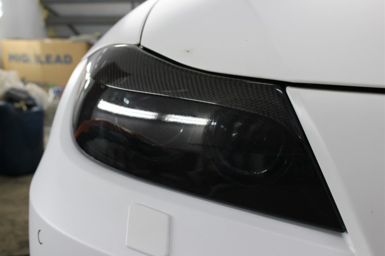 В первую очередь мы сделали предварительную диагностику, сняли фары и стало понятно, что на автомобиле BMW E-60 ранее уже были отполированы фары и поклеена бронепленка, но уже прошло 4 года с этого момента и пленка под механическим воздействием пыли, камней и химии на автомойки пришла в негодность и фары стали “мутными”.