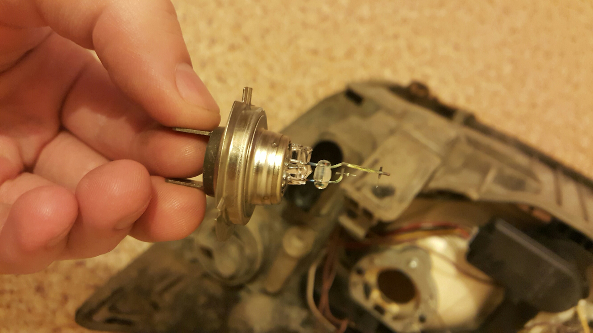 - Далее надо отсоединить разъем от контактов лампочки.