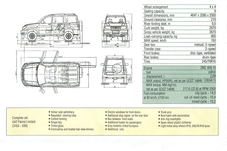 | Двигатель | Бензиновый ЗМЗ 409051 = 4 цилиндра, Евро-5 |