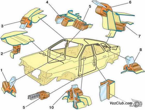 ВАЗ/2113, 2114, 2115/ремонт/кузов/каркас/Правка кузоваКонструкция каркаса лада 2113, инструкции по ремонту и замене деталей кузова лада 2114, руководство по снятию и установке омывателя ваз 2113, ваз 2115, ваз 2114. Правка кузова Ремонт каркаса, устройство кузова Ваз 2114, Ваз 2115, Ваз 2113 своими руками ремонт кузова кузов, обслуживание своими рукамиОсновные справочные размеры для проверки пола кузова: 0 – базовые линии; 1 – оси передних болтов крепления растяжек передней подвески; 2 – центр опоры передней подвески силового агрегата; 3 – центр опоры левой подвески силового агрегата; 4 – центры верхних шарниров передних телескопических стоек передней подвески; 5 – центры шарниров рычагов передней подвески; 6 – точки пересечения осей приварных болтов крепления рулевого механизма с поверхностями кронштейнов; 7 – точки крепления задней опоры подвески силового агрегата; 8 – точки пересечения осей задних приварных болтов крепления рычагов задней подвески с поверхностями задних лонжеронов; 9 – центры верхних опор амортизаторов задней подвески Значительная часть ремонтных работ по автомобилям ваз 2115, тем более поступающим после дорожно-транспортных происшествий, приходится на ремонт кузовов ваз 2113. В большинстве случаев при ремонте требуется проверка геометрии точек крепления узлов и агрегатов шасси автомобиля лада самара 2Повреждения кузова автомобилей могут быть самыми различными. Поэтому правила ремонта в каждом отдельном случае должны быть свои, наиболее подходящие для этих повреждений, при этом необходимо максимально использовать возможности рихтовки поврежденных панелей. По возможности необходимо избегать термического воздействия на металл, чтобы не нарушать заводскую сварку и антикоррозионную защиту кузова. Лицевые панели кузова снимать только в крайних случаях, чтобы определить места повреждений, выправить или выверить кузов.В случаях значительных повреждений кузова рекомендуется снимать все внутренние обивочные детали, чтобы облегчить измерение, контроль и установку гидравлических и винтовых домкратов для устранения перекосов и повреждений кузова ваз 2114.