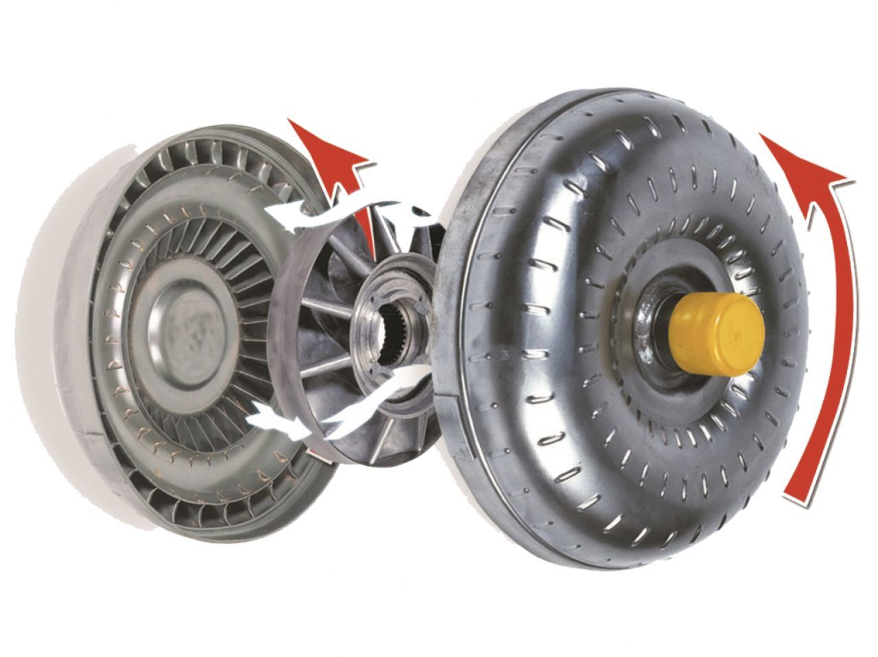 Крыльчатка, также известная как вход, вращается быстрее, чем турбина, которая является выходом. Жидкость, вытекающая из входа, заставляет выход вращаться и передает энергию по всей системе. Оба колеса размещены в маслонаполненном корпусе, который удерживает их на месте.