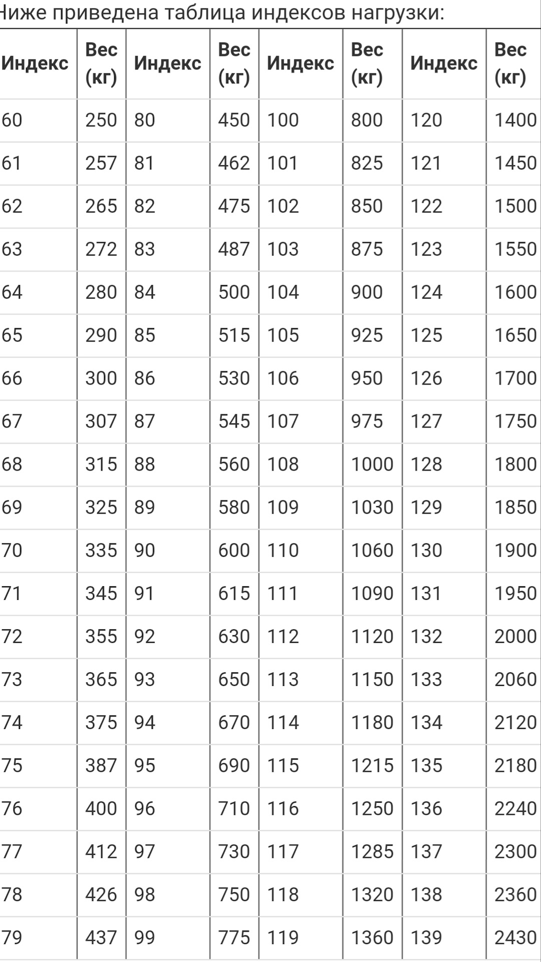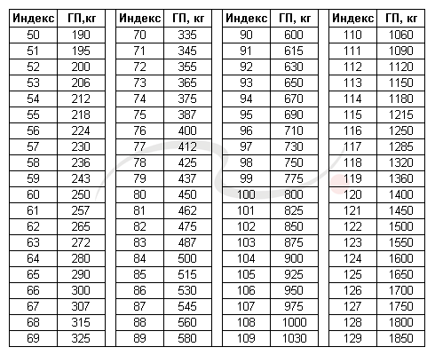Индекс нагрузки определяет максимально допустимую нагрузку в килограммах на шину. Чтобы шина вела себя предсказуемо, нельзя превышать максимальную скорость и максимальную нагрузку, на которые эта шина рассчитана. Для того, чтобы определить, подходит ли шина для вашего автомобиля, посмотрите вес вашего автомобиля в тех паспорте, прибавьте к этому весу полезную нагрузку, которую вы возите в автомобиле (пассажиры + багаж), и сравните с максимальным весом, на который рассчитана шина. Максимальный вес надо умножить 4 (число колес автомобиля), чтобы определить суммарный вес, который шины выдержат.