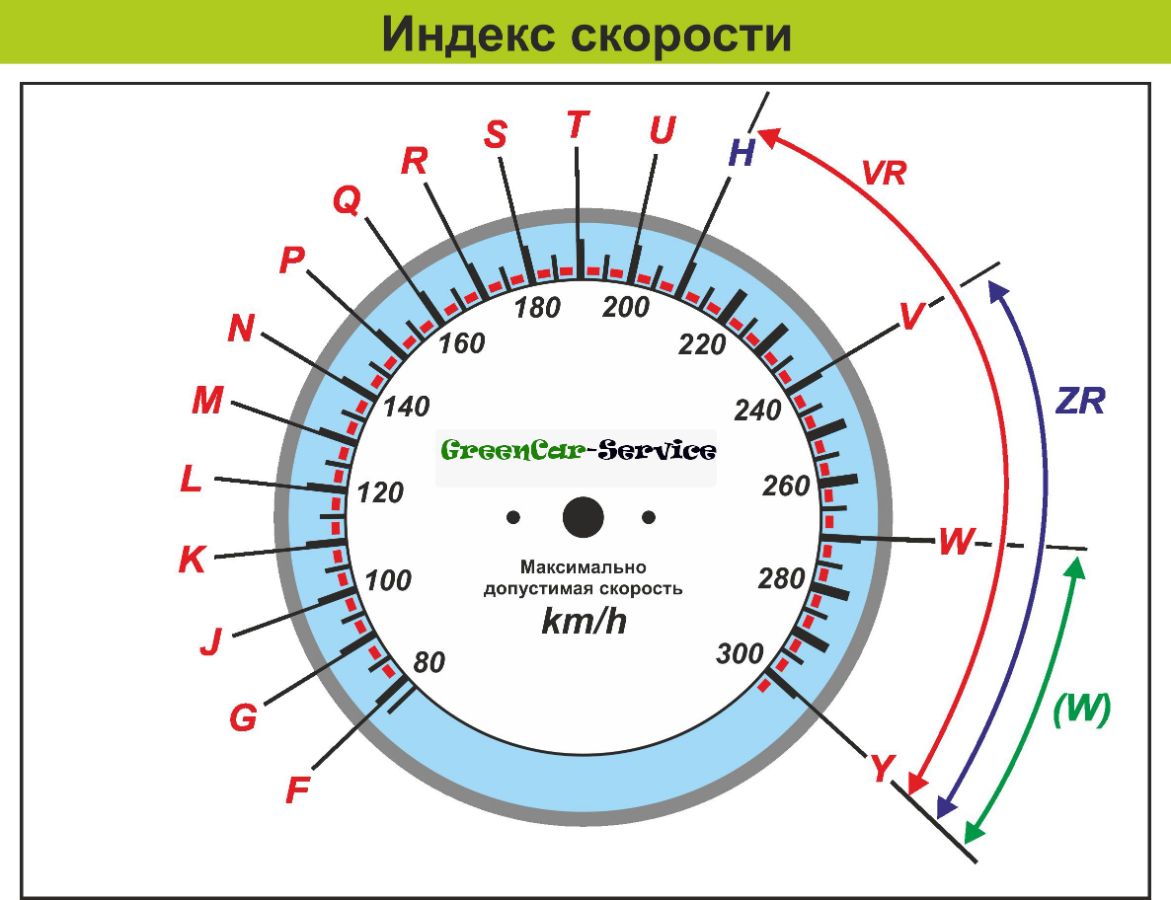 Показатель, обозначающий максимально допустимую скорость при эксплуатации именно этого вида резины. Индекс скорости обозначается буквами латинского алфавита. Обозначения начинаются с самых маленьких и завершаются самыми высокими (5-300 км/ч).