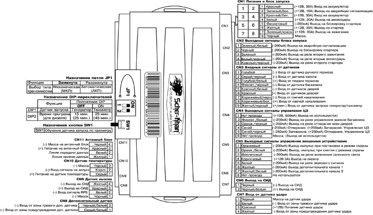 На базовой схеме почему-то не показано, как именно подключают первый шнур 9-контактного разъема. В действительности, если речь идет только о Шерхане А, к «шнуру 1» подключают датчики «минусовой полярности»:
