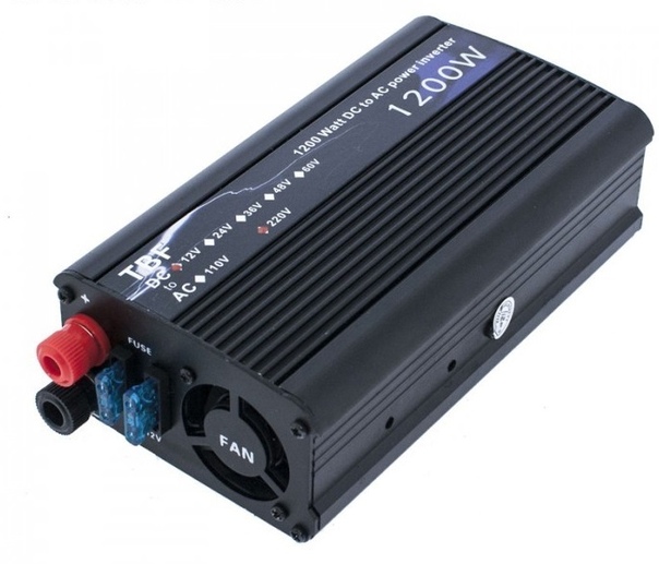 Синусоидальный инвертор 12-220 В, мощностью 1500 Вт. Допускается перегрузка инвертора до 3000 Вт в течение 2 сек. Рабочий диапазон входного напряжения от АКБ: 10,5 — 14,5 В. Есть режим энергосбережения. Корпус металлический.