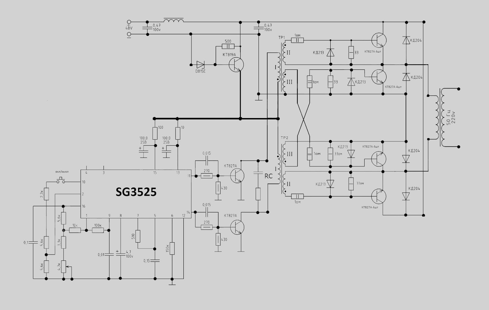 Это повышающий двухтактный DС-DС преобразователь, основой служит шим контроллер SG3525, в отличие от старой доброй TL494 эта микросхема имеет мощный выход и способна управлять полевыми транзисторами с большой ёмкостью затвора без дополнительного драйвера.
