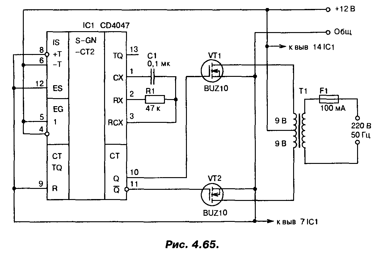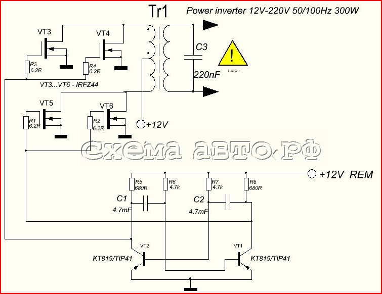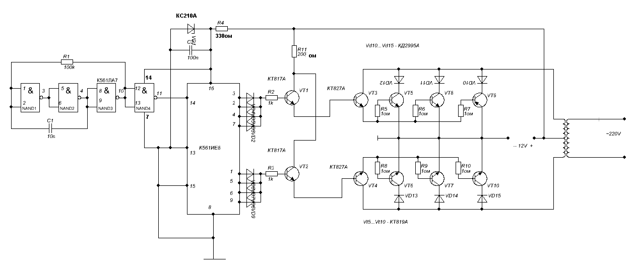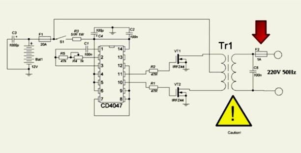 Данная схема позволяет получить на выходе почти сетевые 220 Вольт с частотой 50Гц (зависит от частоты мультивибратора. На выходе нашего инвертора прямоугольные импульсы, но с выводами прошу не спешить — такой инвертор пригоден для питания почти всех бытовых нагрузок, за исключением тех нагрузок, которые имеют встроенный двигатель, который чувствителен к форме подаваемого сигнала.