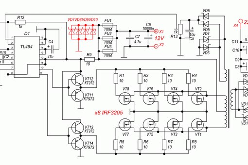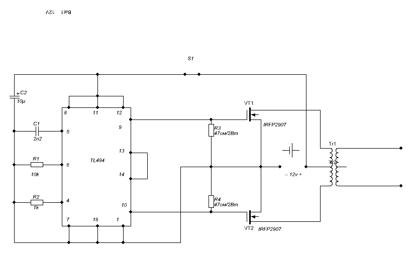 Основу генератора составляет микрочип ТЛ 494, у которого есть дополнительный драйвер. Необходимо провести замену маломощных биполярных транзисторов на отечественные аналоги (КТ 3107).