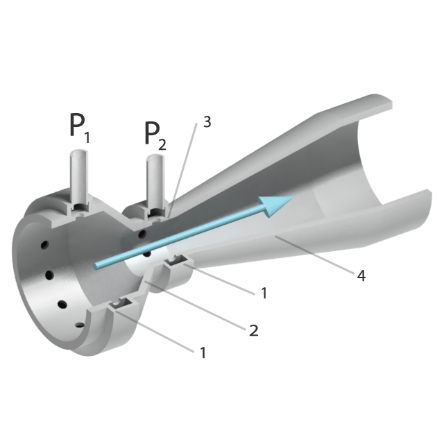 - Проходя в камеру смесителя через сопло с уменьшающимся диаметром, поток жидкой среды приобретает заметное ускорение, что способствует формированию в такой камере области с пониженным давлением.
