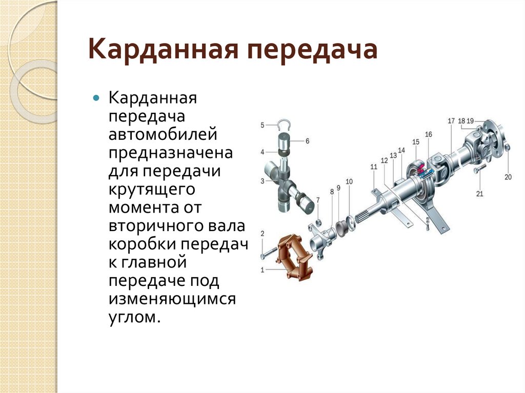 С помощью карданной передачи осуществляется подвод крутящего момента от коробки перемены передач (КПП) или раздаточной коробки к ведущим мостам, к ведущим управляемым колесам, а также к механизмам дополнительного оборудования автомобиля.