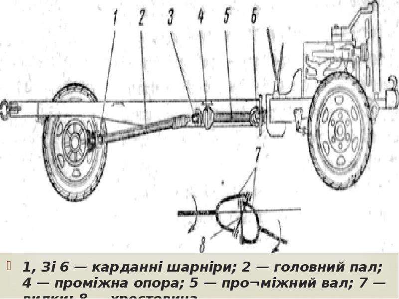 Передний 3 и задний 7 карданные валы изготовлены из тонкостенной стальной трубы.