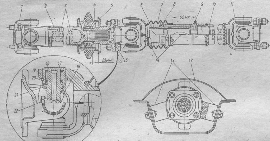 У переднего карданного вала с обоих концов приварены шлицевые наконечники, а у заднего карданного вала — вилки карданных шарниров. Задний наконечник переднего карданного вала установлен в шариковом подшипнике 22, размещенном в стальном корпусе, который завулканизирован в резиновой подушке промежуточной опоры 4.