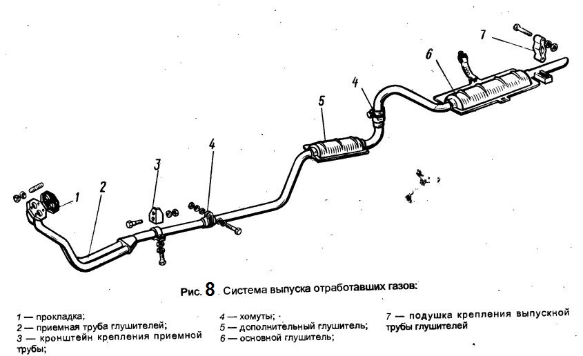 Он, в свою очередь, состоит из четырех компонентов: трубы, соединяющей резонатор или каталитический конвертер с глушителем, глушитель, выхлопная труба и наконечник выхлопной трубы.