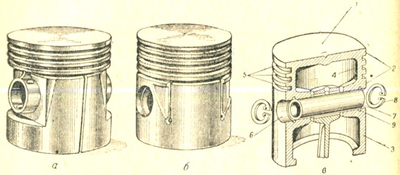 Поршень состоит из трехосновных частей: днища, уплотняющей части с проточенными в ней канавками для поршневых колец и юбки, поверхность которой соприкасается с зеркалом цилиндра. Днище поршня вместе с внутренней поверхностью головки цилиндра, образующее камеру сгорания, непосредственно воспринимает давление газов: оно может быть плоским (двигатели ЗИЛ-130, ГАЗ-53-11), выпуклым (двигатель автомобидя «Москвич-2140») и фасонным (дизели ЯМЗ, КамАЗ).