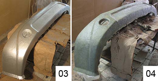 На матрицу наносят три слоя тефлоновой полироли. Она предотвратит прилипание бампера к матрице. Можно применить также и воск. Далее первым слоем при формировании формы применяют матричный гелькоут с алюминиевой пудрой, который по своему составу фактически является смолой, но как правило при затвердевании получается более равномерным, чем смола. Также он имеет глянцевый вид. Для последующих слоев берут полиэфирную смолу. Эта смесь доводится до состояния густой сметаны, наносится тонкими слоями. Сверху укладывают еще и стеклоткань.
