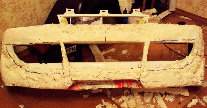 Если вы берете пенопласт, листы можно соединить между собой с помощью жидких гвоздей, создать блок прямоугольной формы, размеры которого будут несколько превышать габариты штатного бампера. Берется нож, хорошо заметный маркер, наносится разметка, все вырезается и пр. То есть несколько часов работы позволят создать пенопластовый макет в натуральную величину, и по нему уже создавать новые бампера. Но при наличии старого бампера так заморачиваться не обязательно.
