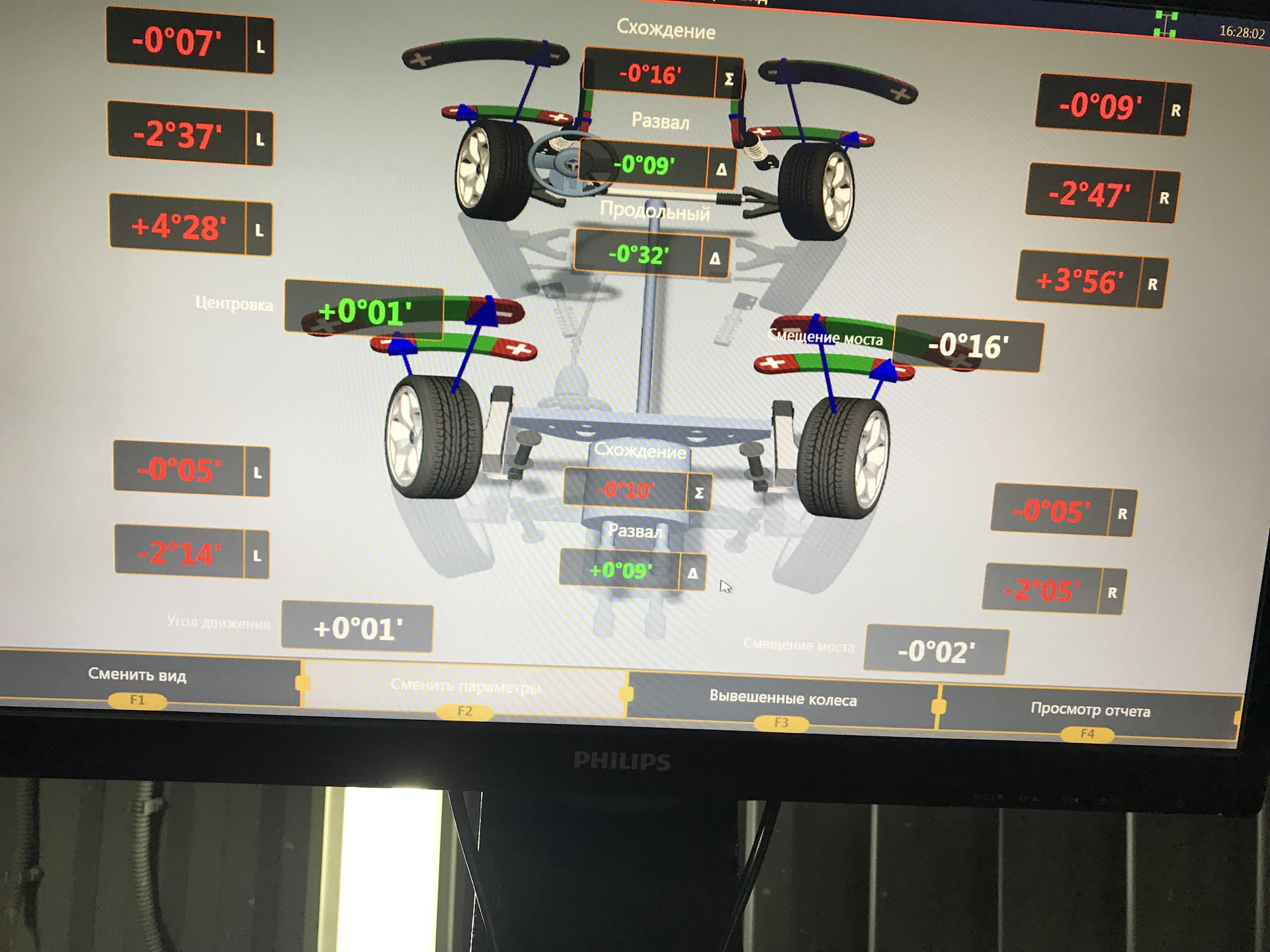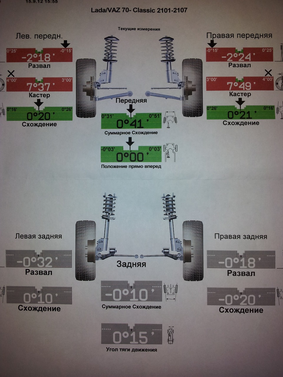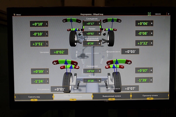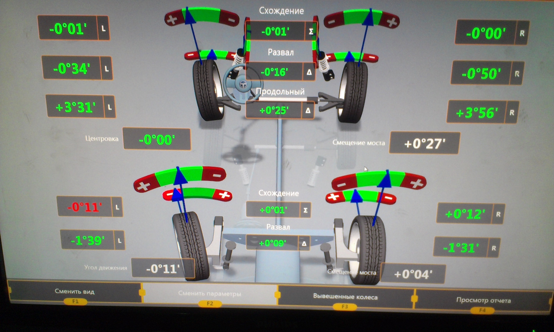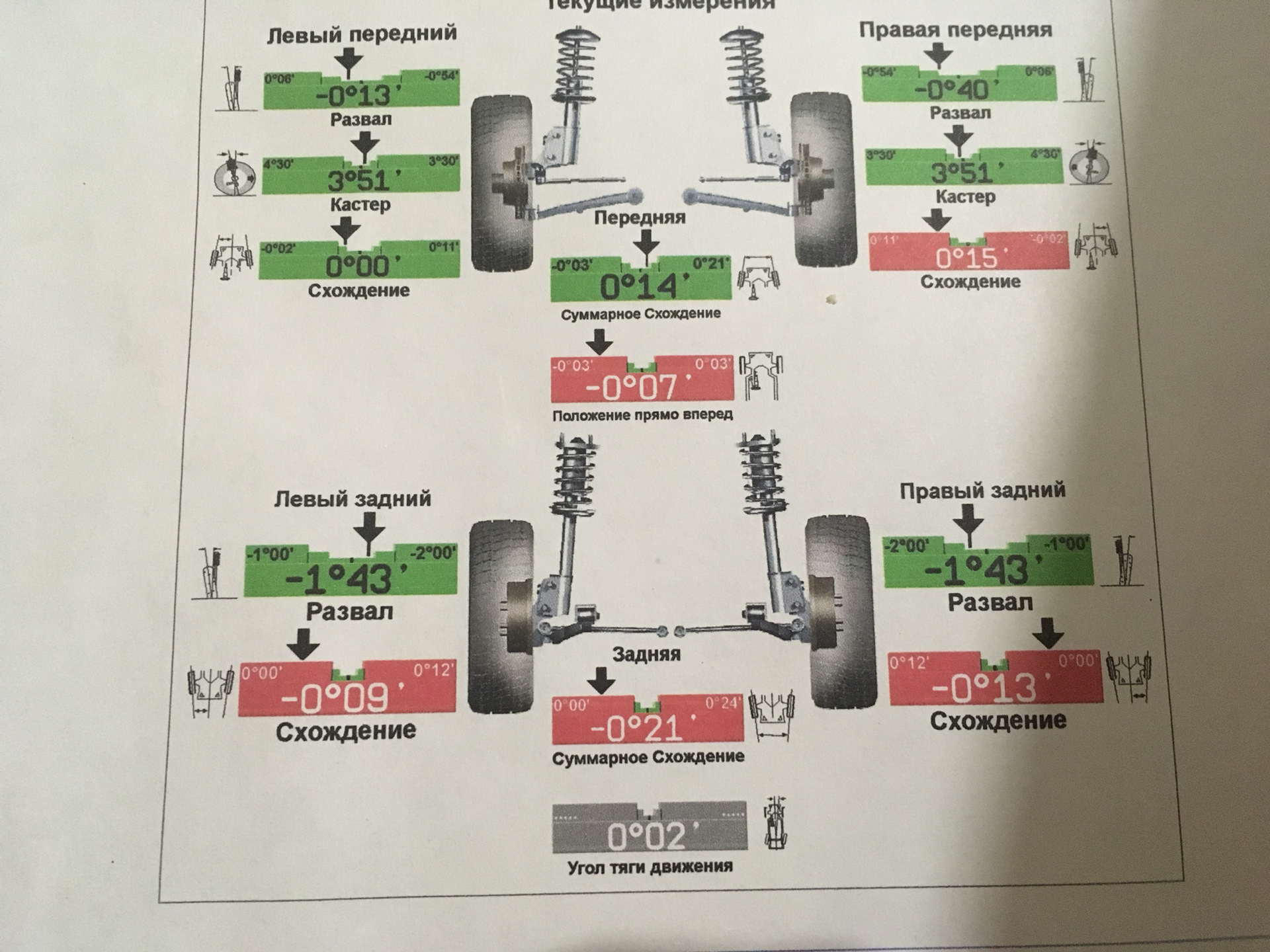 Если автомобиль успешно прошел все испытания, осуществляется регулировка развал-схождения при помощи современного оборудования. По окончании манипуляций Вы получаете распечатку с характеристиками: угол развала правого и левого колеса (для обеих подвесок) и угол схождения, угол движения авто и др.
