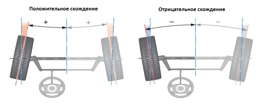 Термином «схождение» обозначают угол между плоскостью вращения колеса и продольным сечением авто. Если передние части колес находятся ближе друг к другу, чем задние, отмечается положительное схождение.